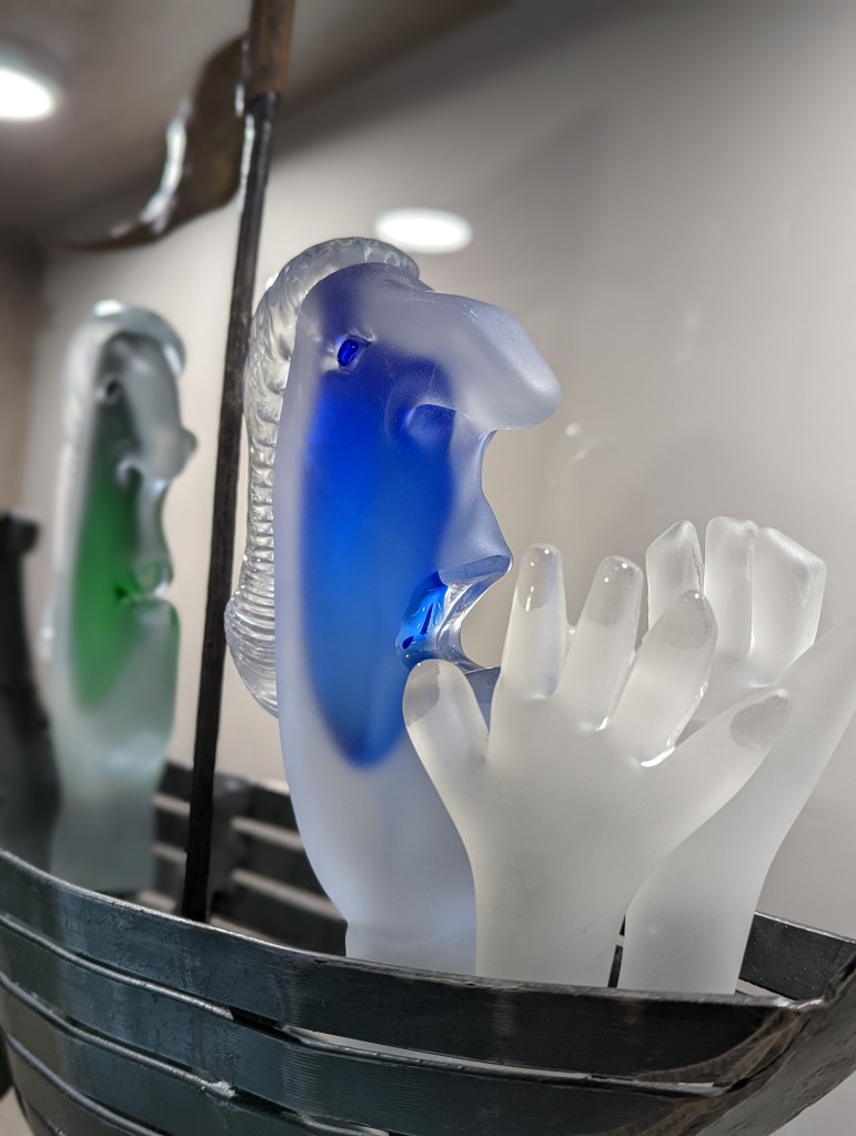 I first came across the work of Karlin Rushbrooke in 2019 when his ‘Dragonfly’ sculpture was featured by Simon Bruntnell Photography but it was his current work of glass heads embarking in steel boats and featured on the GCS Spotlight page, that engaged and beguiled me. Karlin is a long-serving skilled artist who graduated from Stourbridge school of art and his work is held in many renowned collections.