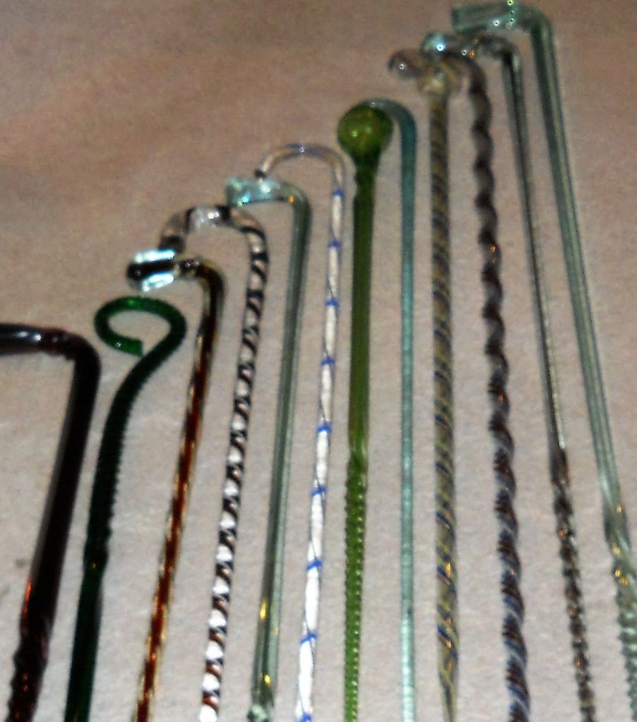 Also known as whimseys in the United States, are glass oddities or ornaments, made by glassworkers in their downtime, and using the poorer quality metal in the bottom of the glass pot, known as tail-glass, or end-of-day glass.